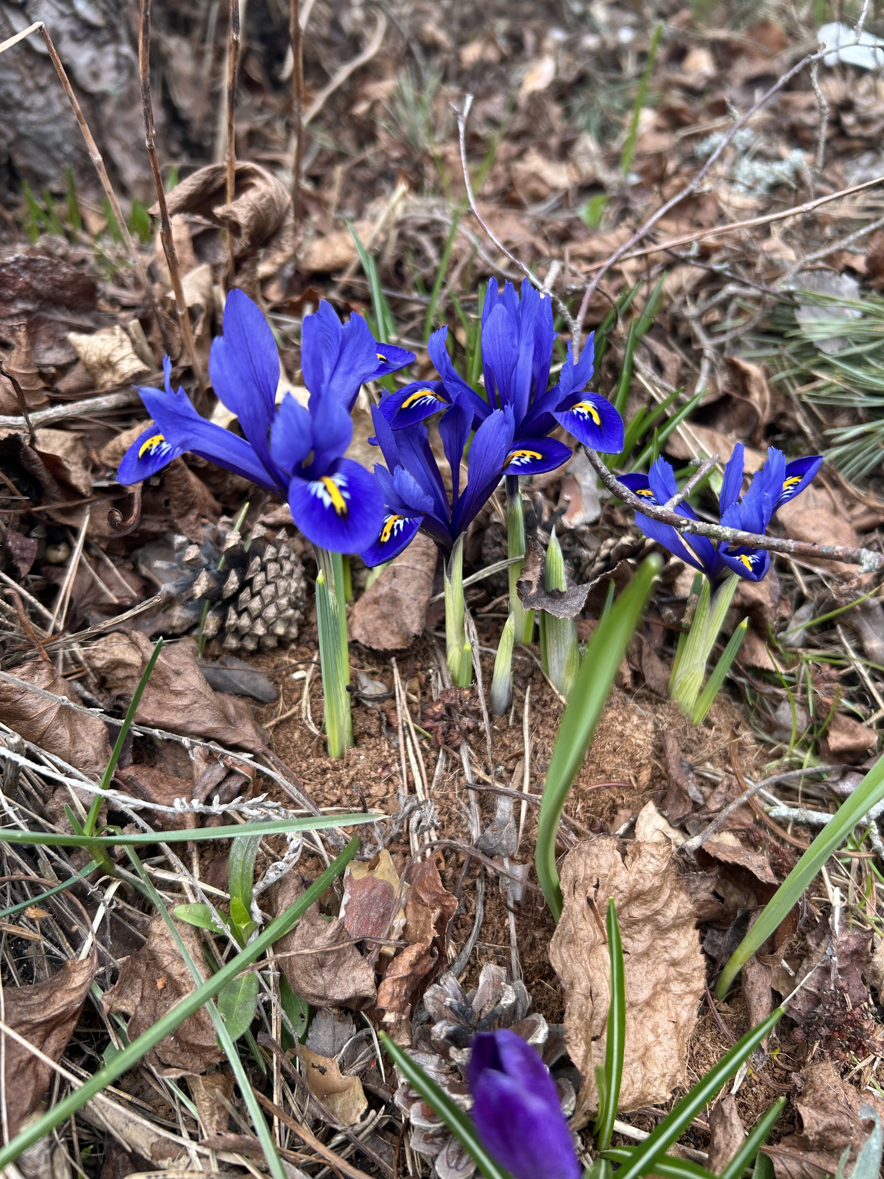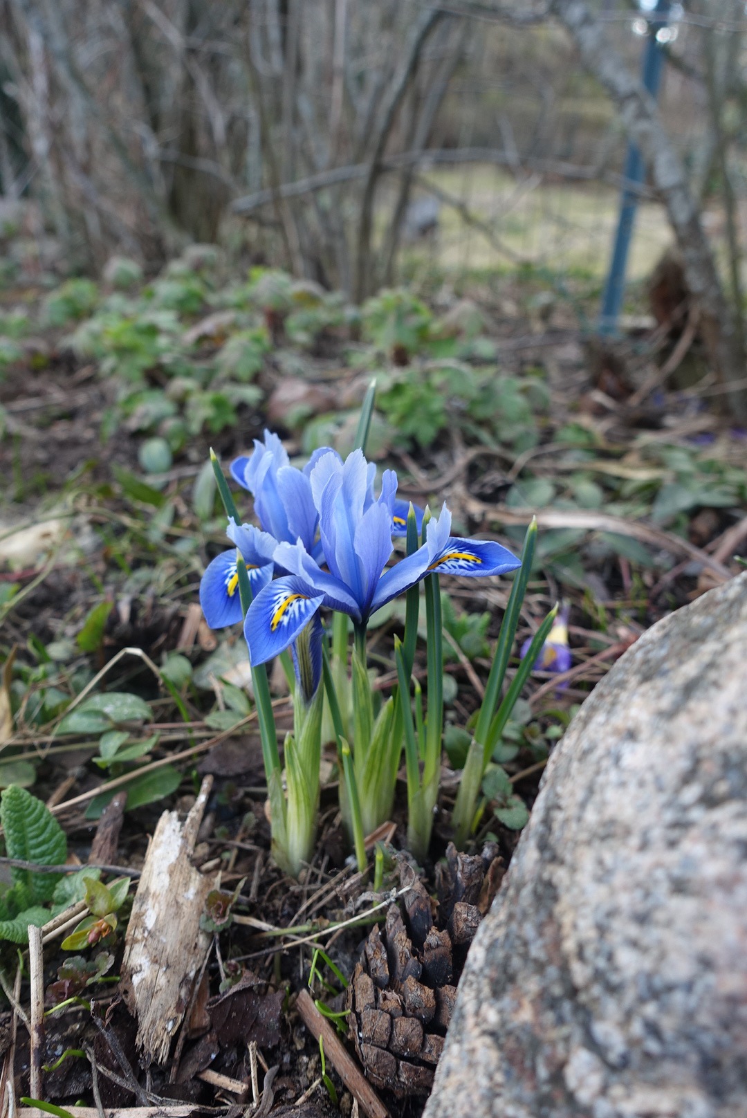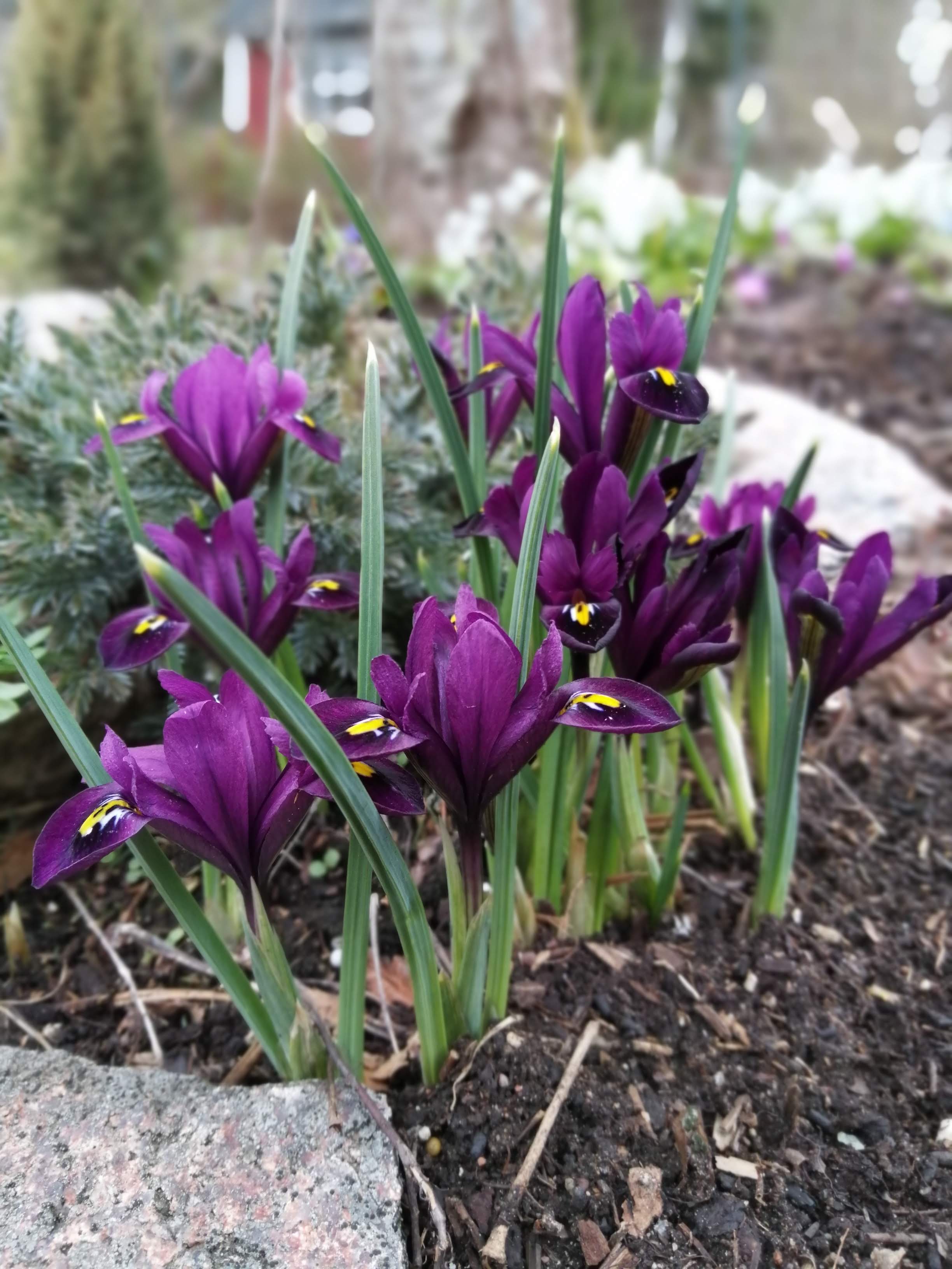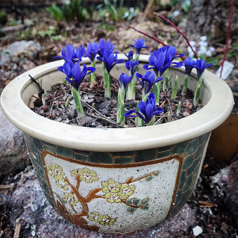Olen lukenut, että nämä pienikokoiset, varhain keväällä kukkivat kurjenmiekat tarvitsevat erinomaisesti vettä läpäisevän kasvualustan. Ajattelin, että ainoa tapa saada kurjenmiekat kukkiviksi asti olisi istuttaa ne ruukkuihin. Istuttelin niitä kuitenkin sinne tänne pitkin pihaa, niin kukkapenkkeihin kuin metsänpohjaankin, kokeillakseni, menestyvätkö kurjenmiekat lainkaan muissa oloissa. Olin todella hämmästynyt, kun etenkin suoraan humukseen istuttamani kevätkurjenpolvet puskivat huhtikuulla metsänpohjasta pintaan ja kukkivat hienosti useamman viikon.