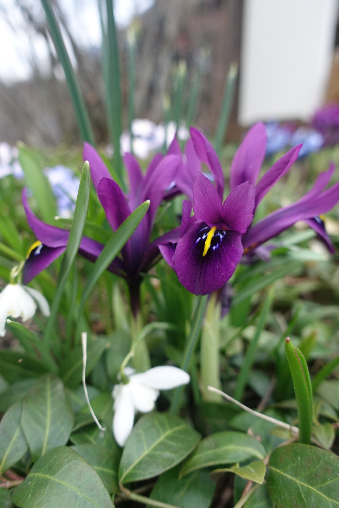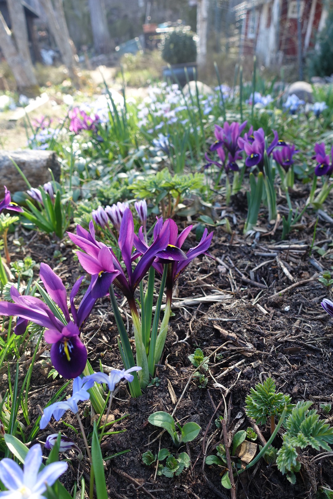 Maaliskuulla lumipeitteiden alta puskevat lumikurjenmiekat (Iris histroides ’George’) olivat henkeäsalpaava näky. Huhtikuulla myös kevätkurjenmiekat (Iris reticulata ’Harmony’, ’Alida’ ja ’Pauline’) liittyivät mukaan väri-iloitteluun.