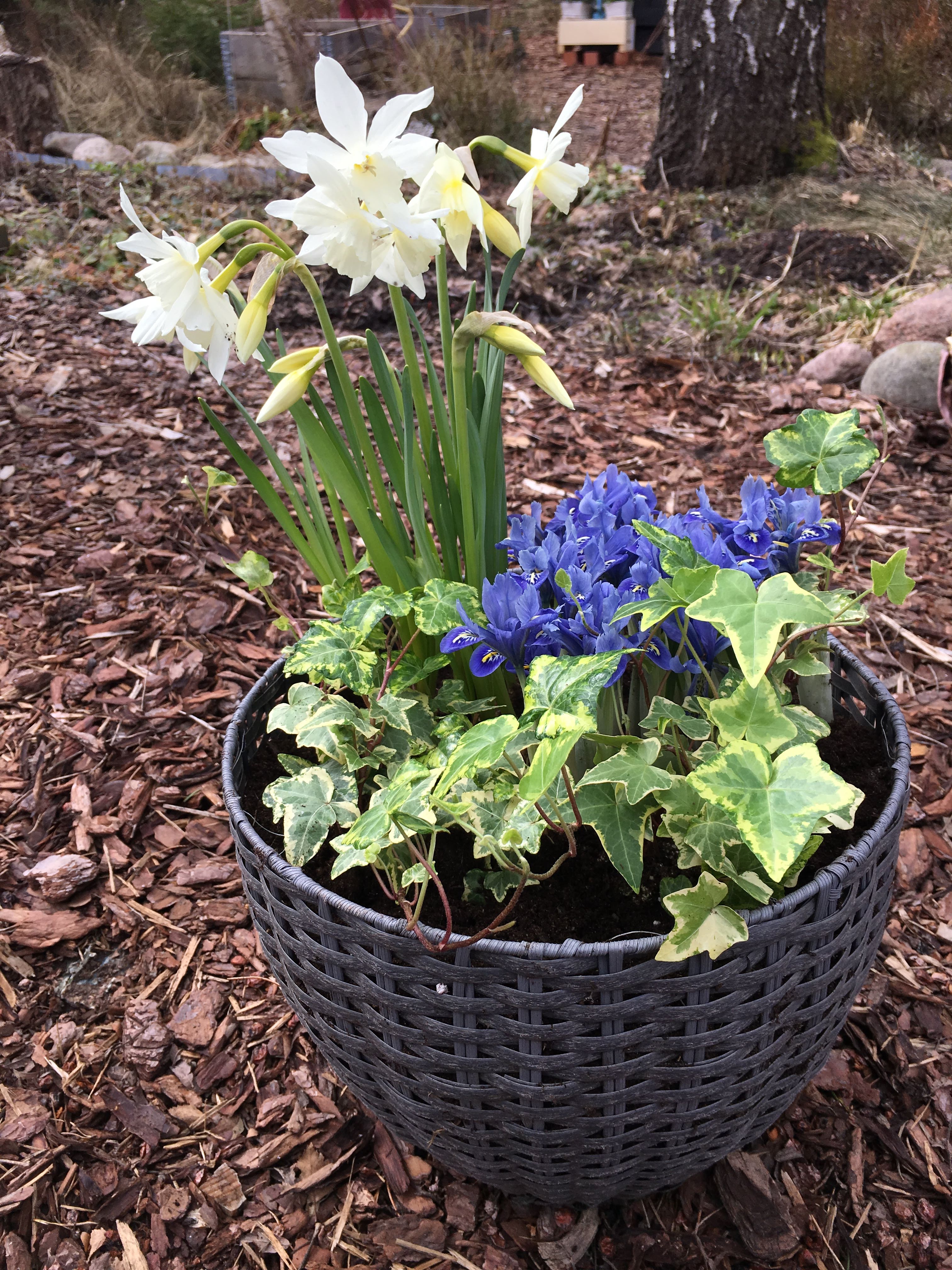 Narsissit ovat saaneet olla rauhassa, joten niiden varassa mennään. Terassin ruukkuja elvyttääkseni ostin perinteisten ’Tête-à-Tête’-narsissien lisäksi sinisiä helmihyasintteja ja keltaisia tuoksuhyasintteja korvaamaan jyrsijätuhoja. Nämä sipulit istutan kukkanurmikolle ruukkukukinnan päätteeksi.