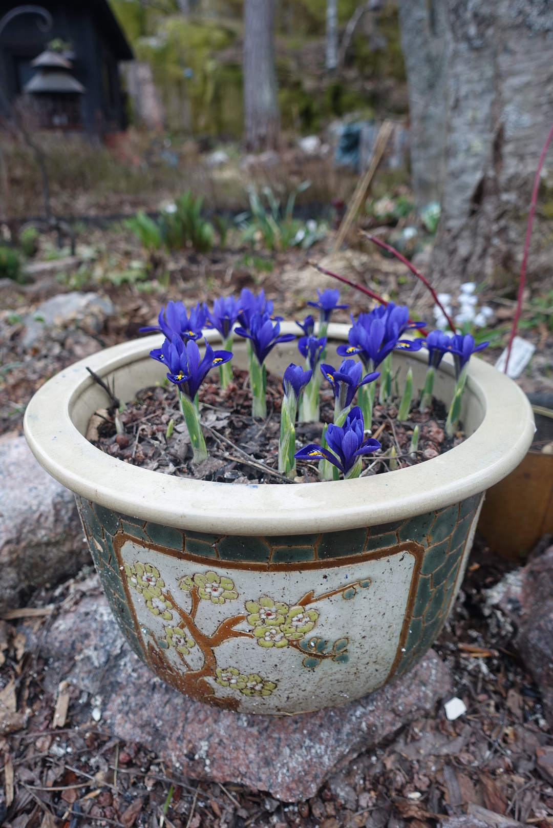 Parhaimmiksi sipuleiksi ruukkuihin ovat osoittautuneet idänsinililjat ja narsissit, joihin ei näiden vuosien aikana ole mikään talttahammas kajonnut ja jotka ovat myös kestäneet erinomaisesti lämpötilan vaihteluita. Viestailinkin jo ystävälleni, että luovutan tulppaanien suhteen, enkä myöskään enää yritä kasvattaa krookusruukkuja, sillä ne eivät ole kertaakaan tainneet onnistua liki vuosikymmenen puutarhurointiharrastukseni aikana. Onneksi on nämä narsissit!